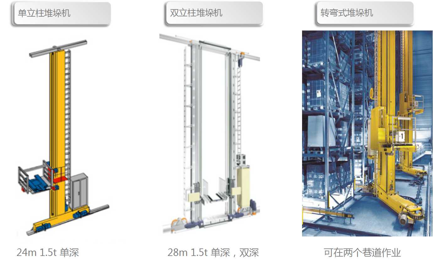 堆垛机是自动化仓储系统的核心部件。是仓储系统中的主要执行设备。负责将货物存入或取出内部货架。载重量从50kg到4t不等。